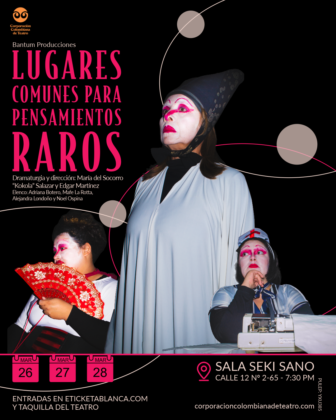 Jueves 26, viernes 27 y sábado 28 de marzo. Funciones: 7:00 pm Bogotá / Colombia / Obra: Lugares comunes para pensamientos raros / Grupo: Bantum Producciones Dramaturgia: María del Socorro “Kokola” Salazar y Edgar Martínez / Dirección: María del Socorro “Kokola” Salazar y Edgar Martínez Público: Mayores de 15 años / Duración: 60 minutos /... ...