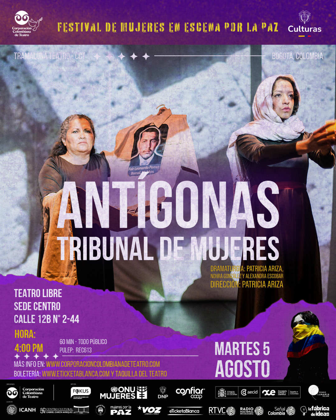 Sinopsis: Antígonas Tribunal de Mujeres ha sido creada entre artistas de la escena y mujeres víctimas de cuatro casos de violación de los derechos humanos en Colombia: madres de Soacha, cuyos hijos fueron asesinados en los mal llamados “falsos positivos” -en ver- dad -ejecuciones extrajudiciales de jóvenes de barriadas pobres presentados por el ejército a la prensa como guerrilleros dados de baja en combate-; mujeres sobrevivientes del genocidio político contra la Unión Patriótica; mujeres defensoras de Derechos Humanos víctimizadas por la seguridad del Estado; mujeres líderes estudiantiles víctimas de montajes judiciales e injustos encarcelamientos. Ellas han convertido su dolor y su memoria en poesía, en grito poético de denuncia y demanda de justicia. Su presencia en la escena como poetas y actrices de su propia tragedia le con- cede una estremecedora verdad a esta obra.