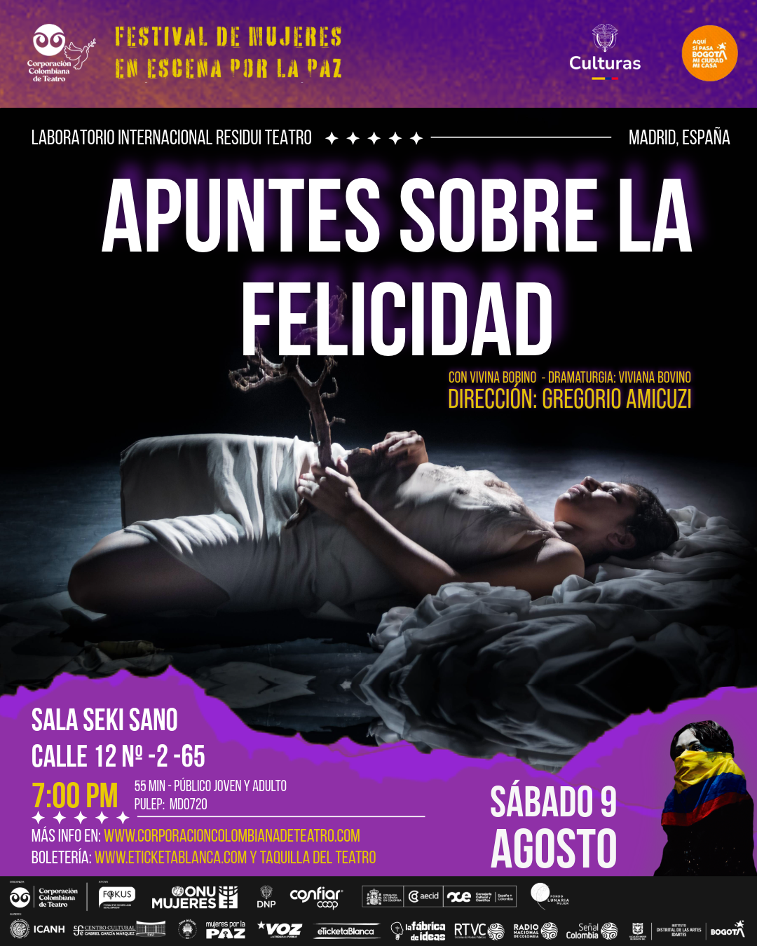 Sinopsis: Una actriz-bailarina pone orden en sus apuntes, en sus cartas, sus análisis. Con 35 años, los médicos le diagnostican una enfermedad grave y le recomiendan una intervención muy agresiva. Ella decide seguir otro recorrido. Empieza a escuchar su cuerpo y a emprender un camino que la lleva a preguntarse: ¿Qué es la felicidad?¿La infelicidad puede transformarse en enfermedad? ¿Cada uno de nosotros puede crear su enfermedad a través de las acciones o las renuncias que cada día cumple? Decide entonces convocar amigos y personas queridas y delante de todos ellos consuma un acto de sanción. Libremente inspirado en la historia real de la bailarina y coreógrafa Anna Halprin, “Apuntes sobre la Felicidad” es un ritual de teatro danza para acercarse a la felicidad. El viaje de “Apuntes sobre la Felicidad“ empieza pasando por reflexiones de filósofos, recuerdos e historias populares. El espectáculo no da respuestas, pero ofrece preguntas. En el medio del escenario una hermosa raíz que es al mismo tiempo un árbol. La raíz es la conexión con los orígenes así como el deseo de transformación. “Apuntes sobre la felicidad” quiere ser un proceso de búsqueda de la armonía, un encuentro con sigo mismo.