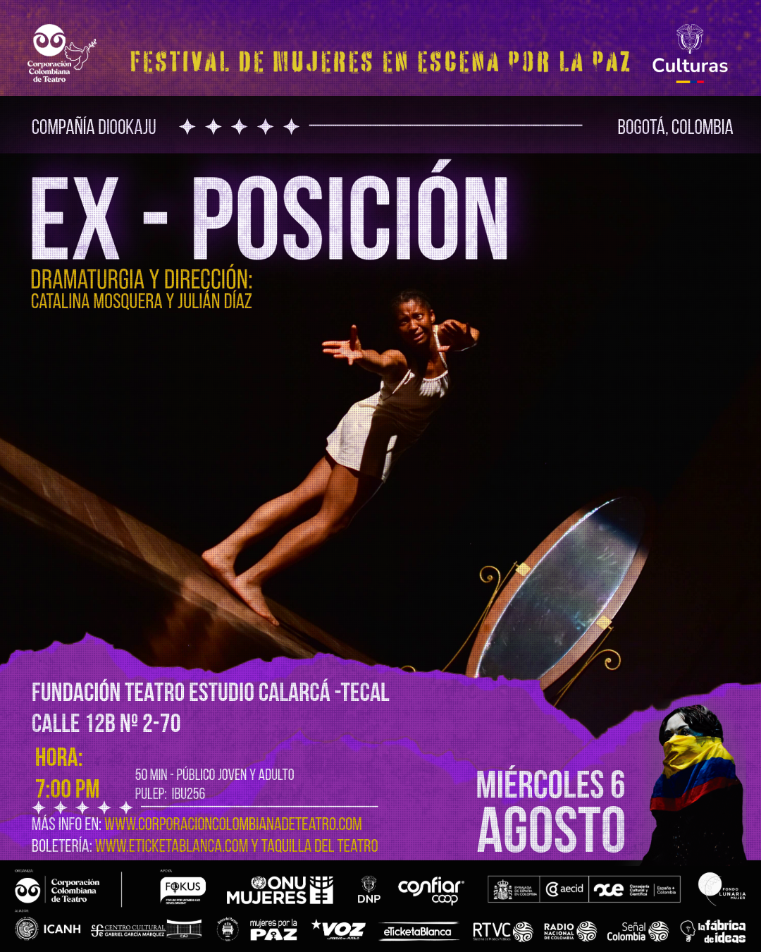 Sinopsis: Ex–Posición es una obra unipersonal, donde se funde la danza afro contemporánea y el teatro (ESCENAFRO) de manera poética para rememorar momentos de la vida que producen aislamientos. La cotidianidad de cada persona es el reflejo de su vida interior, nuestro presente es el resultado de múltiples pasados. EX – POSICION es una puesta en escena que se crea como resultado de la búsqueda de una nueva técnica, una nueva interpretación, de un nuevo estado escénico…para ello tomamos como pretexto, como excusa creativa el día de emancipación de una mujer, que tras un largo periodo de auto encierro, encierro que va más allá de lo físico, trascendiendo a lo emocional, mental y espiritual, ella sin ser consciente queda embotellada en la cárcel de su pasado, de sus recuerdos que se convierten en profundas anclas, taras emocionales que construyen un caparazón físico, dolores que se traducen en miedos, transformándola una especie de ermitaña de su propia existencia.