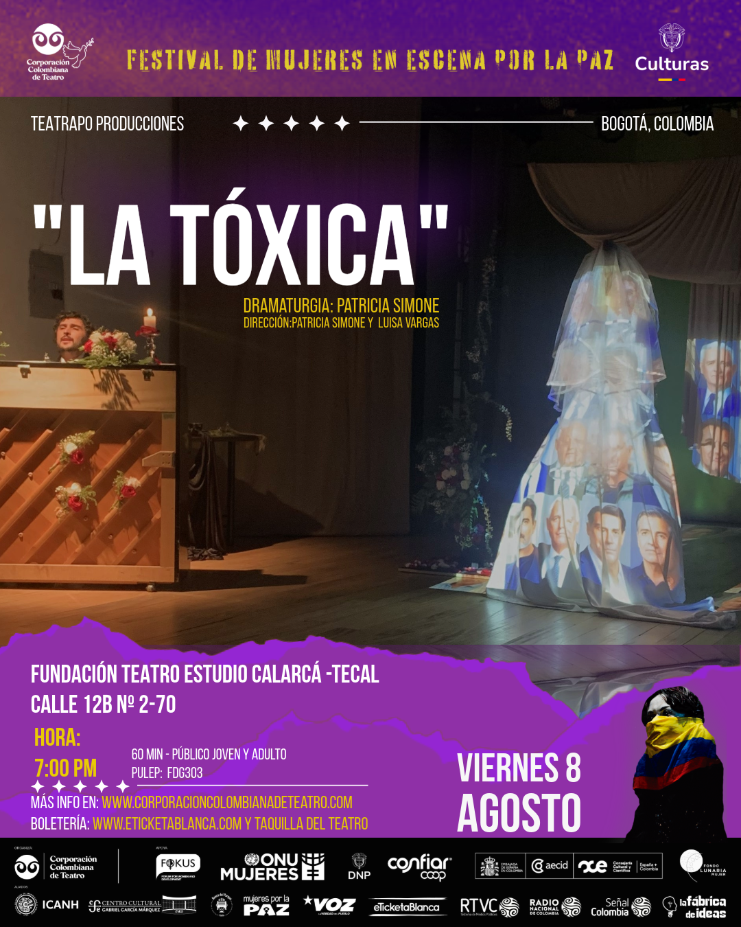Sinopsis: “la TÓXICA” es un monólogo asistido que cuenta la historia de la Sta. Bustamante, hija de un acaudalado empresario que, próxima a cumplir los 33 años, decide casarse con su novio de turno; durante la ceremonia de forma cómica y bastante controvertida, los cientos de empleados de su padre que fungen como invitados serán testigos (obligados) de la montaña de emociones que conforman el cotidiano y desparpajado comportamiento de la joven mujer conocida como “LA TÓXICA”. En clave de comedia, con visos de melodrama y aunando música, canto y teatro, esta pieza lleva vertiginosamente al público (los invitados) por las laberínticas celdas de una mente femenina presa de un dolor inconsciente (producto de una herida de violencia sexual) que ha determinado un carácter y un temperamento que la hacen parecer (¿ser?) una bomba de tiempo. ¿Acaso nuestro propio nivel de toxicidad no es el acumulado de las heridas que inconscientemente nos conforman? El elenco está integrado por Patricia Simone (como la Sta. Bustamante), Nicolás Rozo B. (como el pianista), Isabella Londoño y Sebastián Cruz (como Séquito – Wedding Planner). Contó con la dirección actoral de Luisa Vargas. La dramaturgia fue asesorada por Jaime Chabaud (Méx.) y Marco del Pont (Arg.). Fue ganador de la convocatoria “Muestra Maestra” de la Facultad de Artes ASAB, plataforma en la que se estrenó en noviembre de 2024 e invitado como obra con enfoque de género para desarrollar trabajo comunitario en la Localidad de Fontibón.