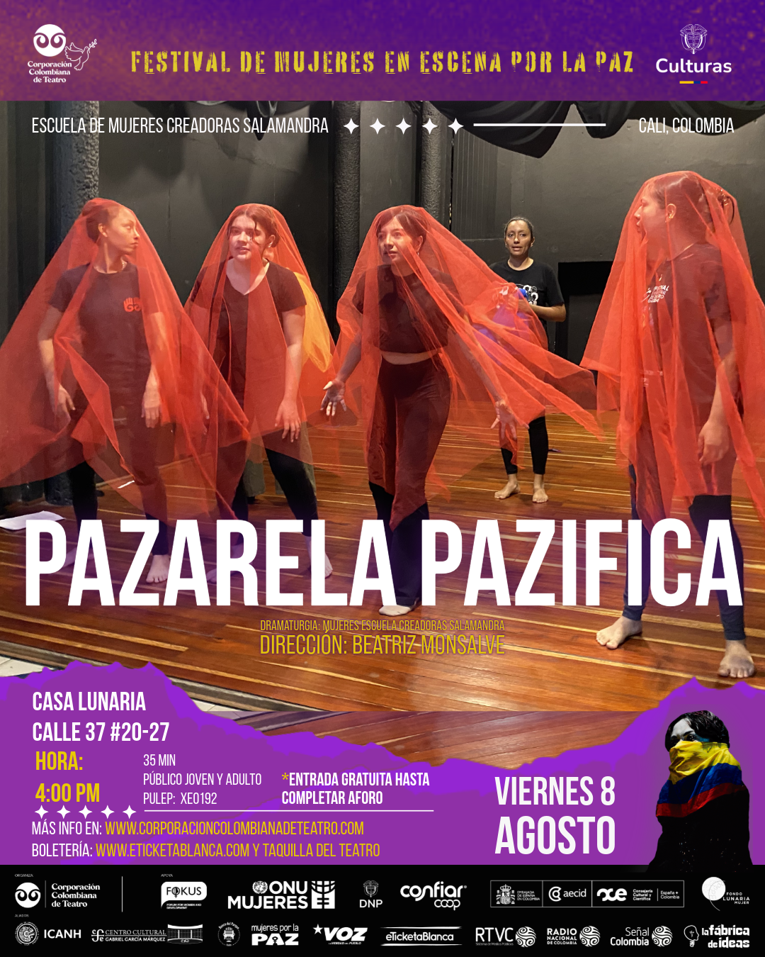 Sinopsis: La Escuela de Creadoras Salamandra (ECS) nace en Cali en 2023 como parte de la Red Úrsulas Polifónicas, Mujeres Libres y Sabias, liderada por la maestra Patricia Ariza. Convoca a mujeres entre los 10 y los 63 años, de procedencia popular, con trayectorias diversas y compromisos con las causas sociales. La ECS funciona en el Teatro Salamandra en el barrio San Fernando, los sábados, donde cada encuentro constituye un espacio seguro, de cuidado mutuo que posibilita la libre expresión, la co-creación y el fortalecimiento de redes de apoyo entre sus participantes. Su trabajo se fundamenta en la Creación Colectiva, transformando vivencias personales y colectivas, en expresiones artísticas a través del teatro, la danza, la música, el performance y la escritura creativa. Desde el teatro, se explora con el cuerpo, la voz, el movimiento y se crean improvisaciones que permiten representar experiencias y dialogar escénicamente sobre las temáticas de actualidad e interés de las mujeres; en la danza, se exploran ritmos y movimientos espontáneos y coreográficos que conducen a composiciones grupales. La música por su parte, propicia la exploración vocal, los juegos rítmicos, la creación de canciones propias. Con la escritura creativa las mujeres evocan su propia experiencia y plasman relatos que ponen sobre la mesa temas de género que históricamente han sido silenciados. Bajo la dirección escénica de la maestra Beatriz Monsalve, las piezas resultantes de la formación en cada línea artística, se ensamblan para dar lugar a puestas en escena, sketches, cuadros performáticos que les permiten entrar en diálogo con públicos amplios y en escenarios diversos.