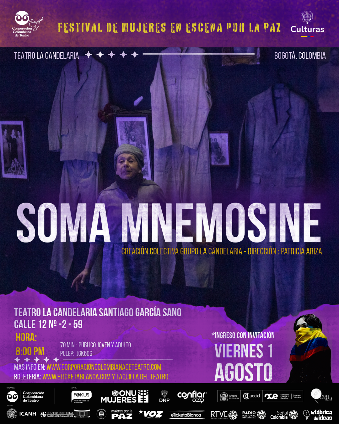 SOMA MNEMOSINE es un teatro performatico. El tema ha sido un punto de llegada recurrente al que, inevitablemente se llega por distintos caminos: el cuerpo personal y social, sometido a la violencia y refugiado en la fiesta como espacio de resistencia. Se trata de una secuencia-cuerpo-persona-cuerpo-sociedad. nacido del trabajo de laboratorio teatral en grupo. En este caso, el pre-texto fue la indagación en el CUERPO tanto en estado de dolor como de júbilo. El resultado es un teatro dentro del cuál el contexto violencia-fiesta del país se nos colocó al interior de los cuerpos de los actores y actrices.