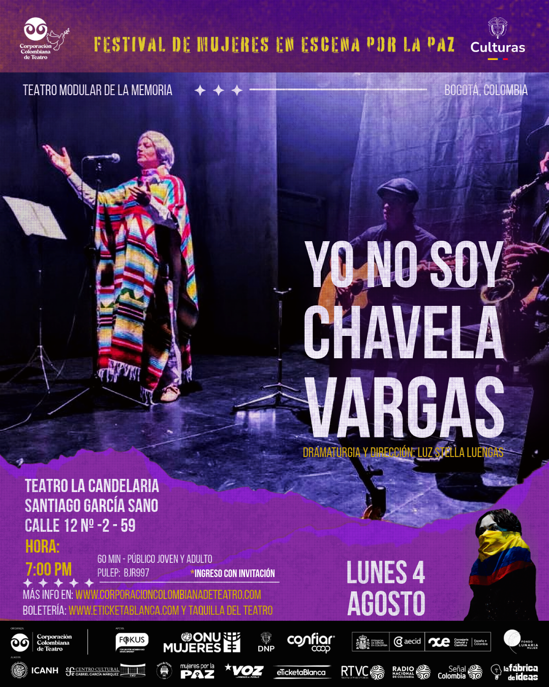 Sinopsis: En un novedoso formato teatral, documental, musical, la obra del Teatro Modular de la Memoria , YO NO SOY CHAVELA VARGAS , hace un tránsito por la vida de la gran cantante Chavela Vargas resaltando momento fundamentales de su vida. La obra nace como un homenaje al espíritu de mujeres valientes.La música resulta un elemento fundamental y novedoso ya que está adaptada por el maestro Efraín Zagarra , músico de jazz.